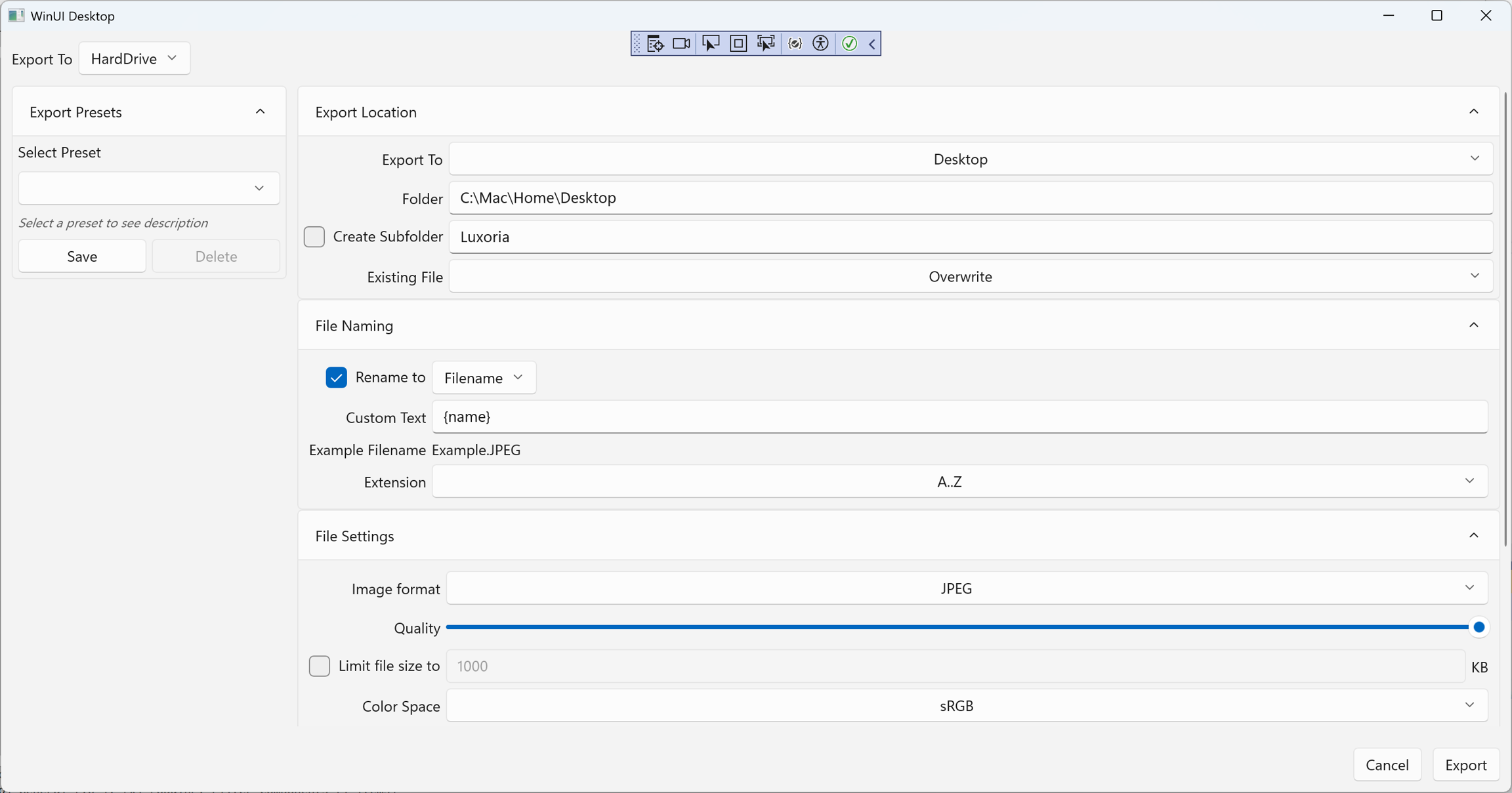 Flexible Export Destinations Choose between Hard Drive and Web export modes, each with tailored options.